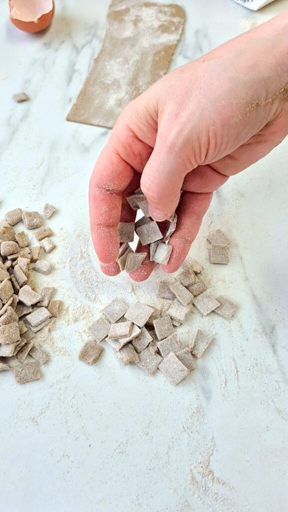 Achtung: nicht zu fein ausrollen, die Crozets sind dicke Nudeln- Ich habe es in meine Nudelmaschine auf 0 und dann auf 1 passiert (sollte 3,7mm sein) Nicht dünner.