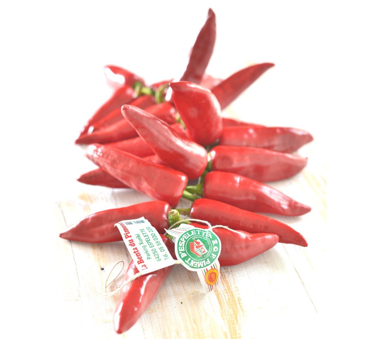 Piment d’Espelette ist eine aromatische und fruchtige Chili–Sorte, die um das Baskische Dof Espelette. Die Apellation d’Origine Protégée (AOP-Kennzeichnung) garantiert die Herkunft und die Qualität des Produkts.