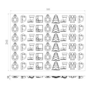 Profi-Schokoladenform aus APET. Damit können Sie einfach 54 wunderschöne “Dekor Schokolade auf den Thema “Weihnachten” gießen, wie ein Maitre Chocolatier. 6 unterschiedliche Formen: Weihnachtskugel, Weihnachtsmütze, Weihnachtsstiefel, Geschenk, Tanne, Engel. Die Gießform kann mehrmals verwendet werden. Größe jeder Form: 3 cm.