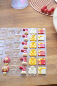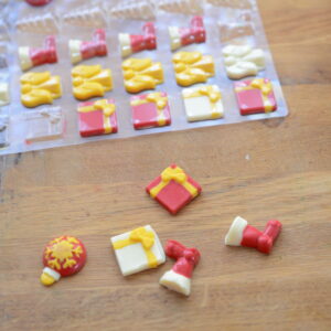 2er Set aus einer weihnachtlichen Schokoladen-Gießform und 4 Dosen Schokoladenfarben (Gelb, Rot, Grün, Blau). Perfekt, um bunte Schoko-Deko für Weihnachten zu zaubern!