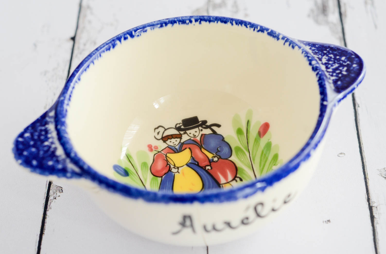 Jeder Bol ist ein klassischer bretonischer Frühstücksbol mit dem traditionellen kleinen Paar und dem blauen Rand – genau wie man ihn aus der Bretagne kennt.