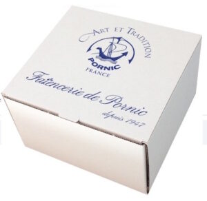 Verpackt in einen weißen Geschenkkarton mit den Faiencerie de Pornic original Muster.