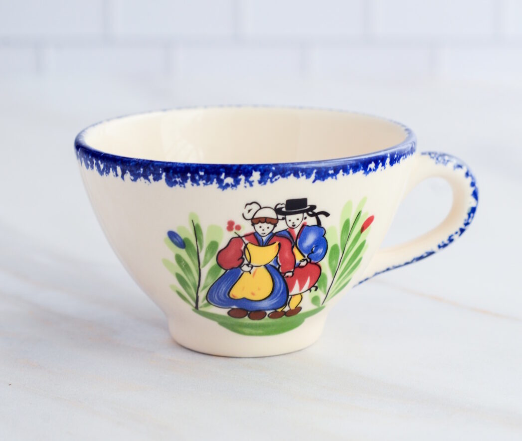 Unsere Bolée ist verziert mit dem klassischen blau-weißen bretonischen Motiv und dem kleinen Bretonen-Paar, ganz im Stil der berühmten traditionellen Keramik aus der Bretagne. Sie wird in einer familiengeführten Werkstatt in Pornic hergestellt, die seit Generationen bretonisches Geschirr fertigt.