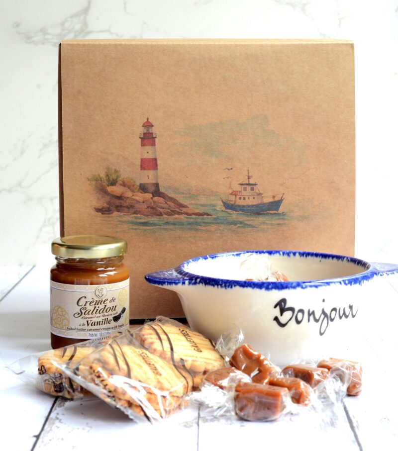 Bretagne Geschenkbox mit Karamell, Galettes & traditionellem Bretonischen Bol „Bonjour“
