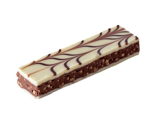 Dunkles Gianduja und knusprige Cerealien, überzogen mit weißer Schokolade, dekoriert mit dunkler Schokolade. Nussige Not en. Feine, knusprige Konsistenz.