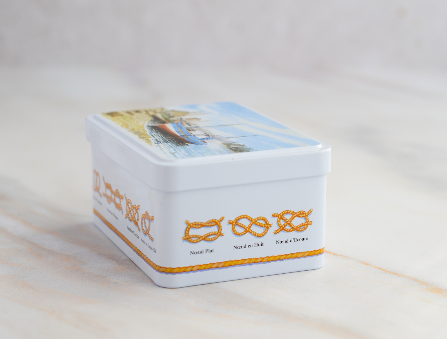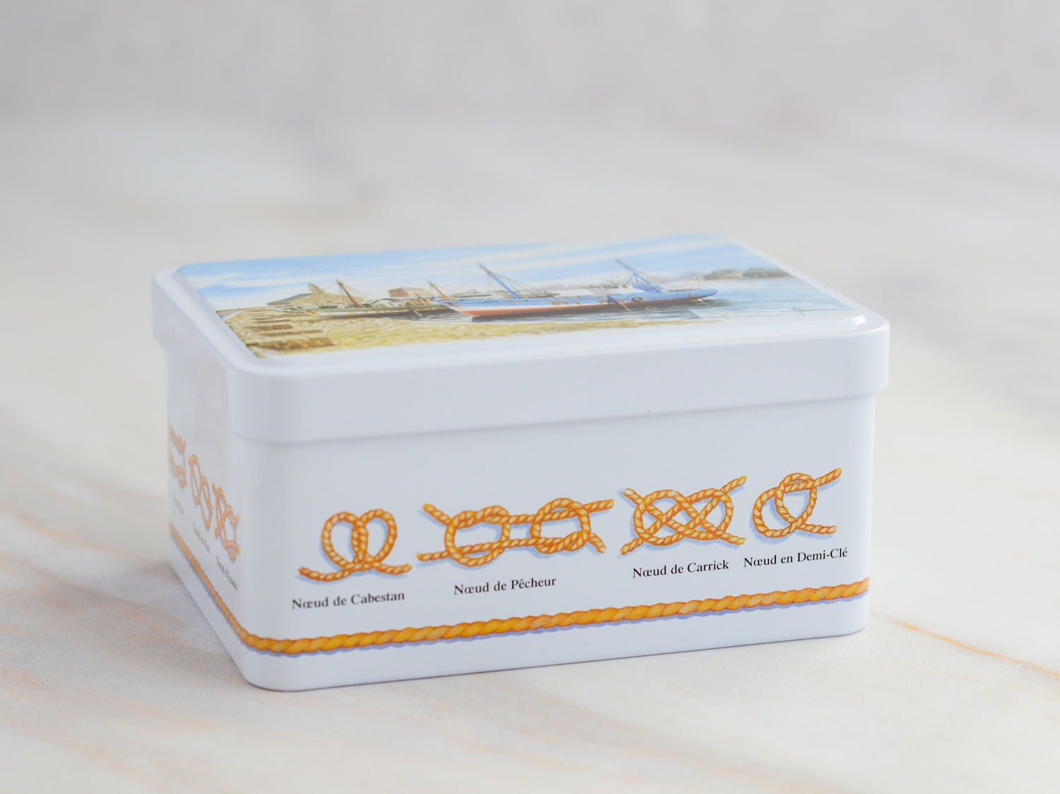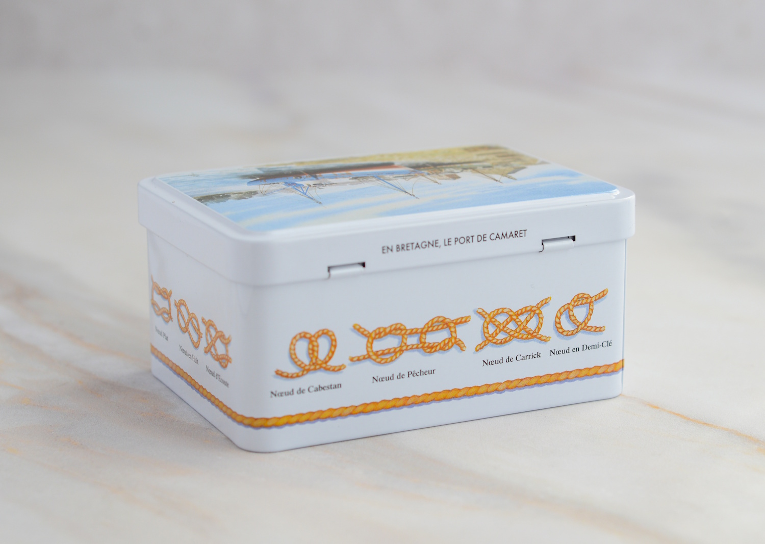 In einer wunderschönen Metallbox mit einem bretonische Hafenlandschaft – den Hafen aus Camaret- und Seemannsknoten.