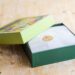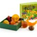 Wunderschöne Geschenkbox mit kandiertem Obst aus der Provence: Melone, Clementine, Zitrone, weiße Birne, Ananas, halber Pfirsich und Orangenscheibe.