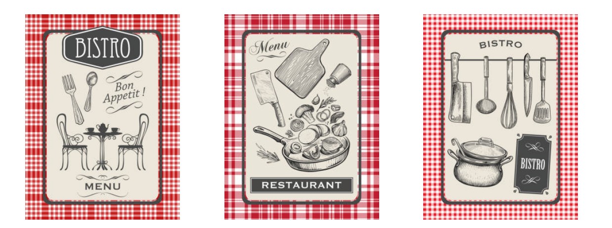 Die liebevollen Illustrationen zeigen typische Bistro-Szenen: Menütafeln, Kochutensilien und kleine kulinarische Details, die an gemütliche Abende bei einem Glas Wein und gutem Essen erinnern.