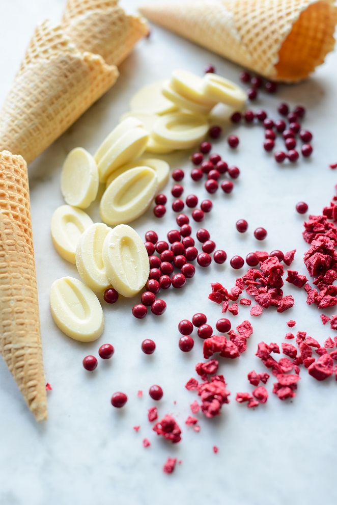 Knusprige und dekorative Perlen mit Himbeer-Fruchtkuvertüre.