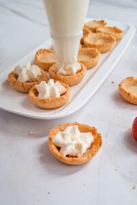 In Crème Patissière oder weisse Schokolade Ganache mit Obstcoulis. Hilft die Creme nicht zu flüssig zu werden und ermöglicht das Aufschlagen bei Sahne, Mischung und Ganache.
