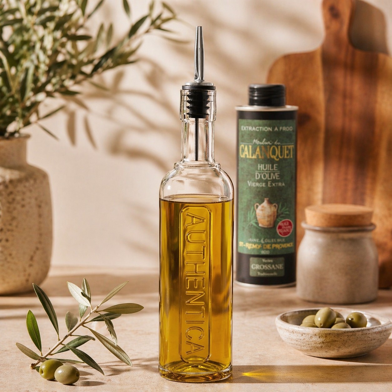 Praktische Olivenölflasche mit Ausgießer, perfekt für unsere Olivenöl aus der Provence.