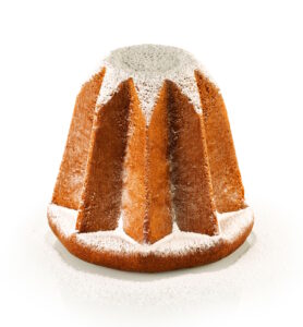 Der Namen “Pandoro” bedeutet goldenes Brot “pan d’oro” auf Italienisch. Er besteht aus einem Hefeteig, der reich an Eiern ist und ihm seine schöne goldene Farbe verleiht. Er wird reichlich mit Puderzucker bestreut.
