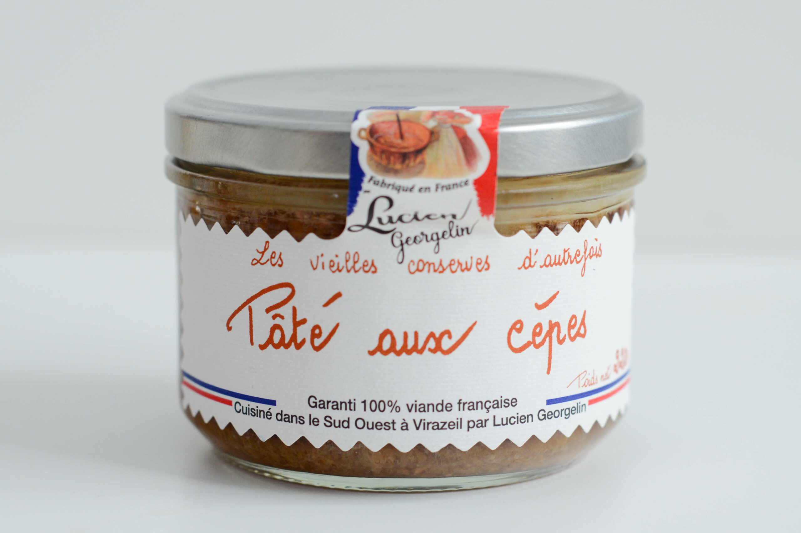 Zutaten: Schweinehals*, Schweinefleisch*, Entenfleisch*, Geflügelbrühe (Wasser, Geflügelkarkassen, Zwiebel, Salz, Pfeffer), Zwiebel, Schweineleber, rehydrierte Steinpilze 3,5% (Wasser, Steinpilze), Karamell (Zucker, Wasser), Salz, Knoblauch, Schweinegelatine, Rum (Rum, Salz, Aroma), Pfeffer. *Herkunft: Frankreich