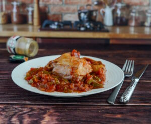 Zutaten: 1/2 Hähnchen, Piperade (Tomaten, Zwiebeln, Paprika), Tomatenmark, Rapsöl, Salz, Zucker, Zitronensaft, Knoblauch und Kräuter der Provence.