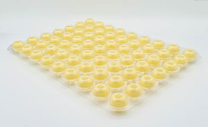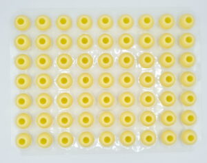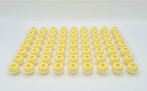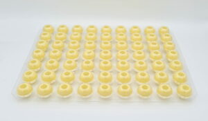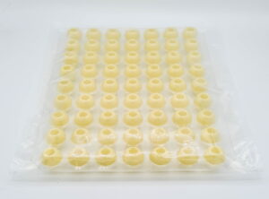 63 praktische Pralinen-Hohlkörper im Blister. Mit weißer Schokolade 35% Ivoire von Valrhona. So einfach geht’s: einfüllen, mit Schokolade verschließen und dekorieren. Durchmesser: Ø 2,7 cm.