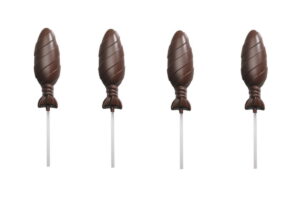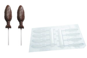 Profi-Schokoladenform aus PVC von Valrhona. Damit können Sie mühelos 4 süße Lollipops (Sucettes) gießen, wie ein Maitre Chocolatier. Die Gießform kann mehrmals verwendet werden. Maße der fertigen Figuren: 2,7 x 8 x 1 cm. Formen für 8 halbe Lutscher.