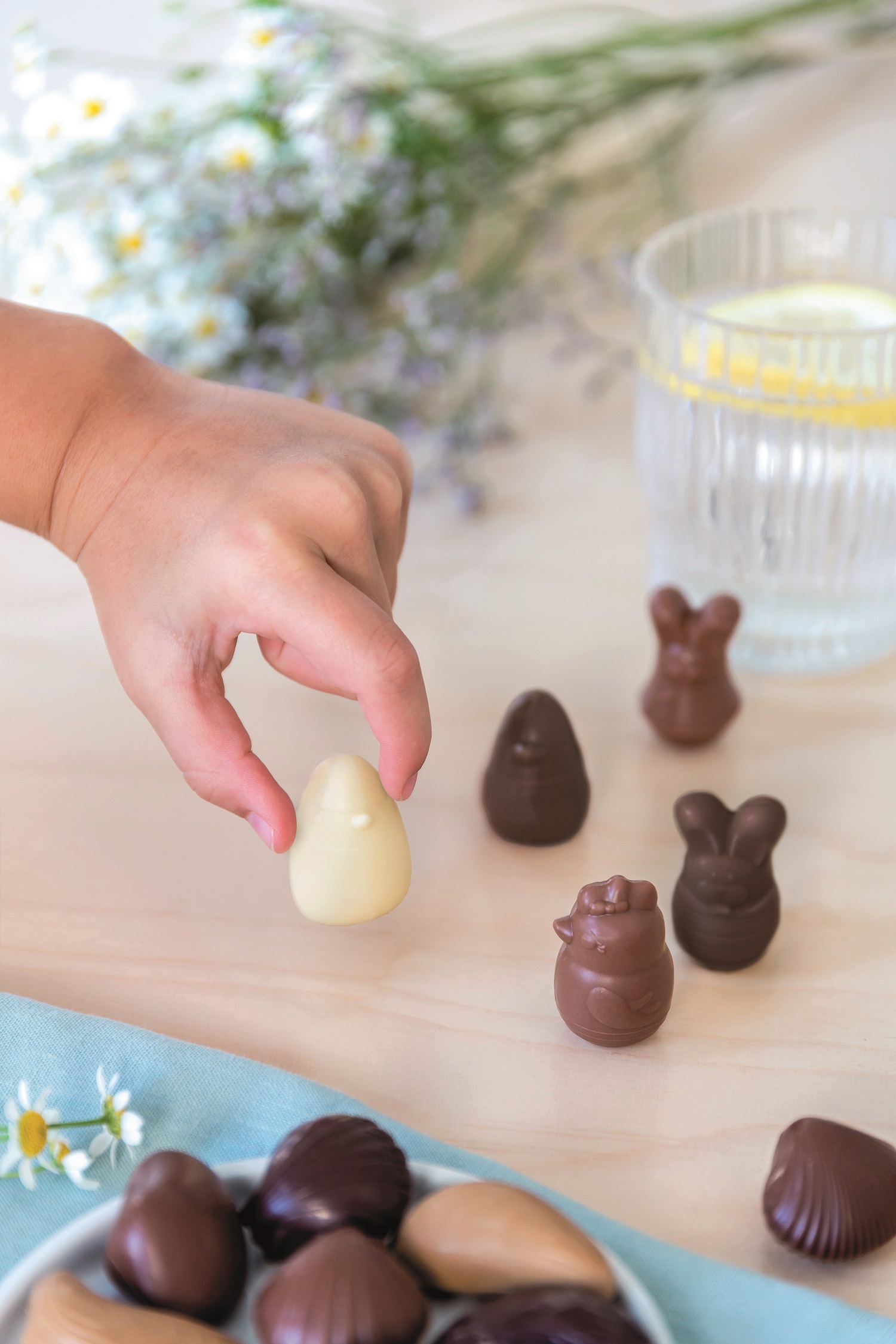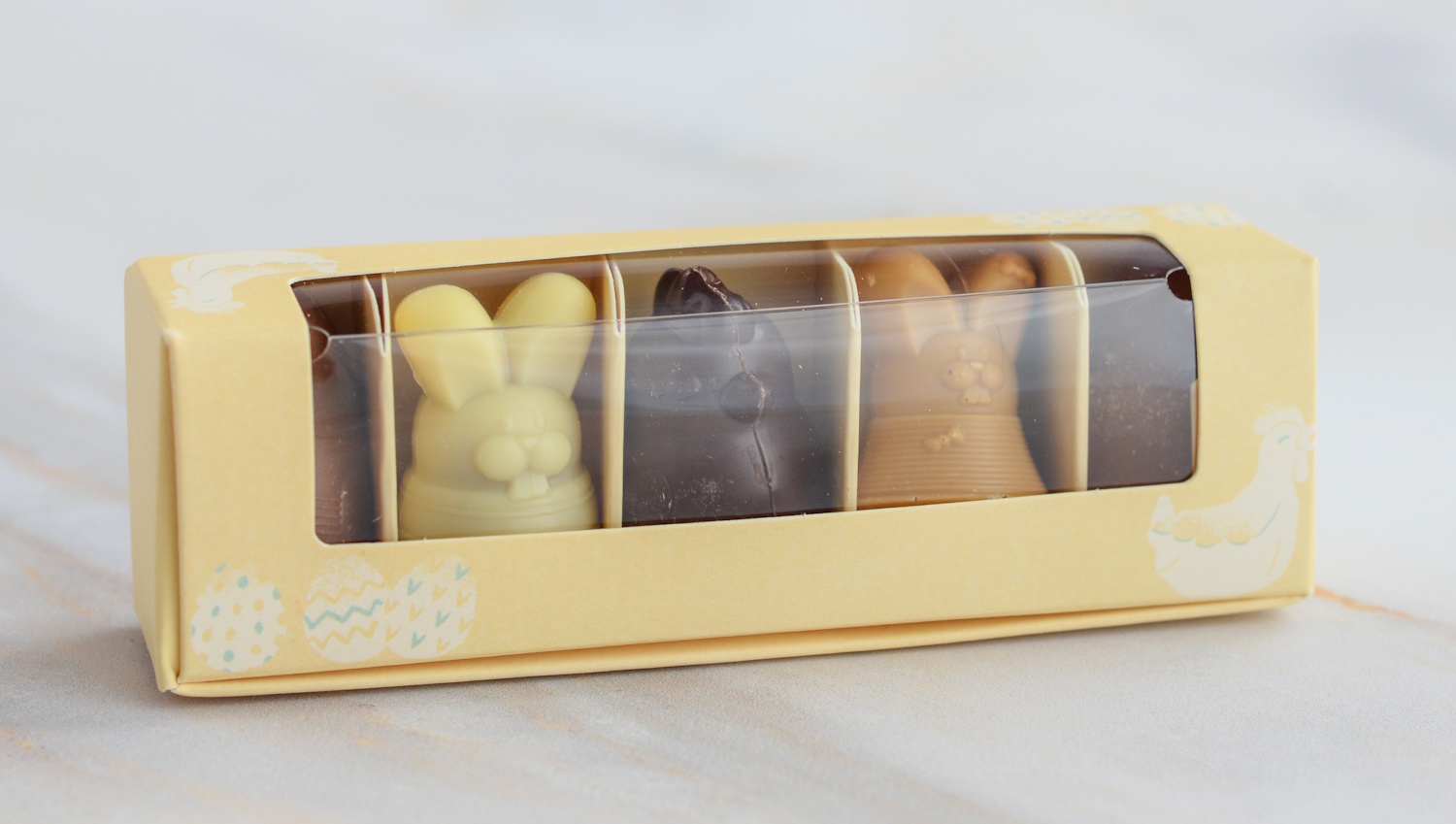 Eine köstliche Mischung aus 5 großen Pralinen von Valrhona. Aus weißer, dunkler, blonder und Milchschokolade und mit Nougat, Karamell, Kokos oder Knusper gefüllt. Garantiert ohne Alkohol und Palmöl.