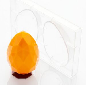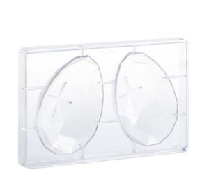 Mit dieser Schokoladenform für Ostereier gelingen Ihnen im Handumdrehen moderne, elegante Schoko-Eier mit einer außergewöhnlichen, facettierten Oberfläche im Diamant-Stil. Die Form besteht aus einer Platte mit zwei Mulden, ideal für die Herstellung von hohlen Schokoladeneiern zum Befüllen oder Dekorieren.