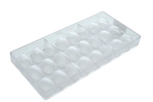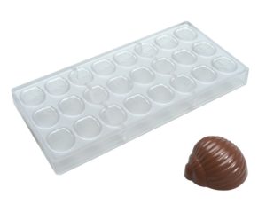 Hinweis: die Form ist fest und besteht aus Copolyester Tritan. Tritan ist fester als Polycabonat und enthält keinen Bisphenol A. Sie ist für Kuvertüre konzipiert. Die Pralinen müssen also auf jedem Fall eine feste Schokoladenhülle besitzen, damit sie problemlos aus den Mulden herauskommen können. Um die Schnecken aus den Formen zu nehmen wird nach dem Abkühlen ( in Tiefkühlschrank) die Form auf dem Arbeitsplatz geklopft.