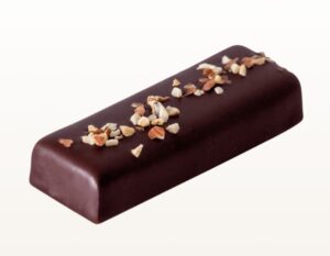 Mandelpraliné mit Crêpe Dentelle, überzogen mit Zartbitterschokolade und dekoriert mit Haselnüssen und Mandelsplittern. Noten von Nüssen. Knusprige Konsistenz.