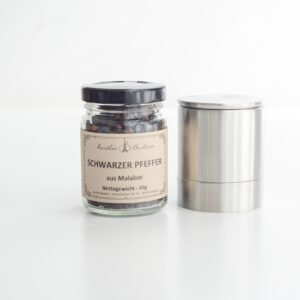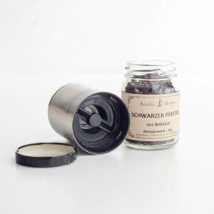 Malabar Pfeffer, mit oder ohne Mühle. Die Malabarküste im Süden Indiens wird auch Pfefferküste genannt. Dort wächst dieses aromatische, würzige und angenehm scharfe schwarzer Pfeffer. Er wird von Hand geerntet und sonnengetrocknet. Frisch gemahlen kann er überall eingesetzt werden.